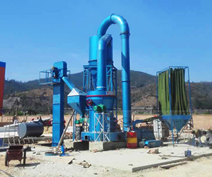 物料粉碎到所需粒度后,由提升機將物料送至儲料斗,再經振動給料機將料均勻連續的送入雷蒙磨粉機主機磨室內,由于旋轉時離心力作用,磨輥向外擺動,緊壓磨環,鏟刀鏟起物料送到磨輥與磨環之間,因磨輥的滾動而達到粉碎目的。物料研磨后的細粉隨鼓風機的循環風被帶入分析機進行分選,細度過粗的物料落回重磨,合格細粉則隨氣流進入成品旋風集粉器,經出粉管排出,即為成品。