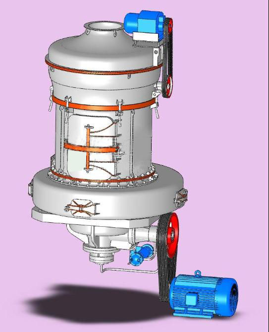 歐版磨粉機的主機工作過程是:通過錐齒輪整體傳動裝置帶動中心軸轉動,軸的上端聯結著磨輥吊架,架上裝有磨輥裝置并形成擺動支點。磨輥裝置不僅圍繞中心軸回轉,還圍繞著磨環公轉,磨輥本身因摩擦作用而自轉。磨輥吊架下裝有鏟刀,其位置處于磨輥下端,鏟刀與磨輥同轉過程中把 物料拋起喂入磨輥磨環之間,形成墊料層,該料層受磨輥旋轉產生向外的離心力(即擠壓力)將物料碾碎,由此而達到制粉目的。
